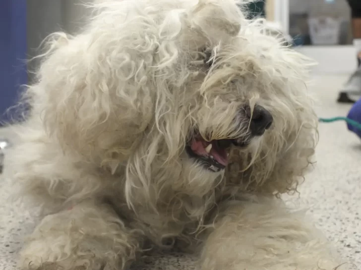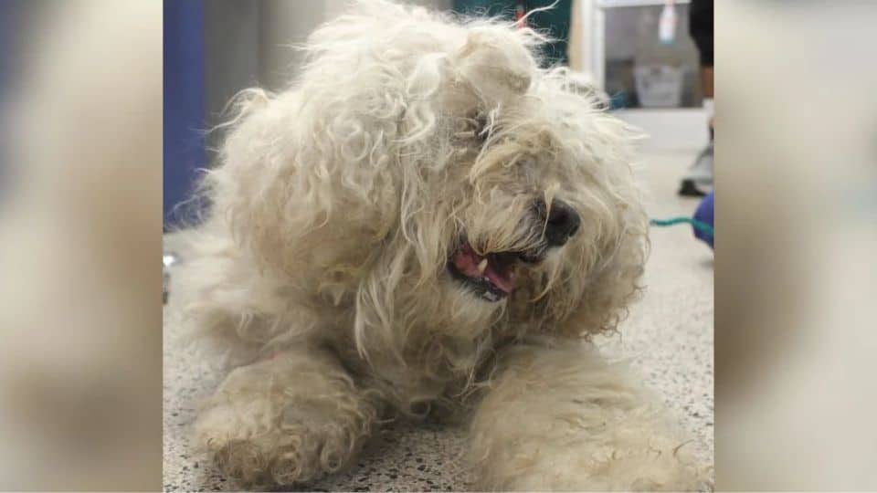 The 15-year-old pup was named Shock, and he was in poor condition. His fur was tangled with thick mats, his nails had grown too long, and cataracts clouded his eyes. He also suffered from a head tilt, which made walking difficult for him.