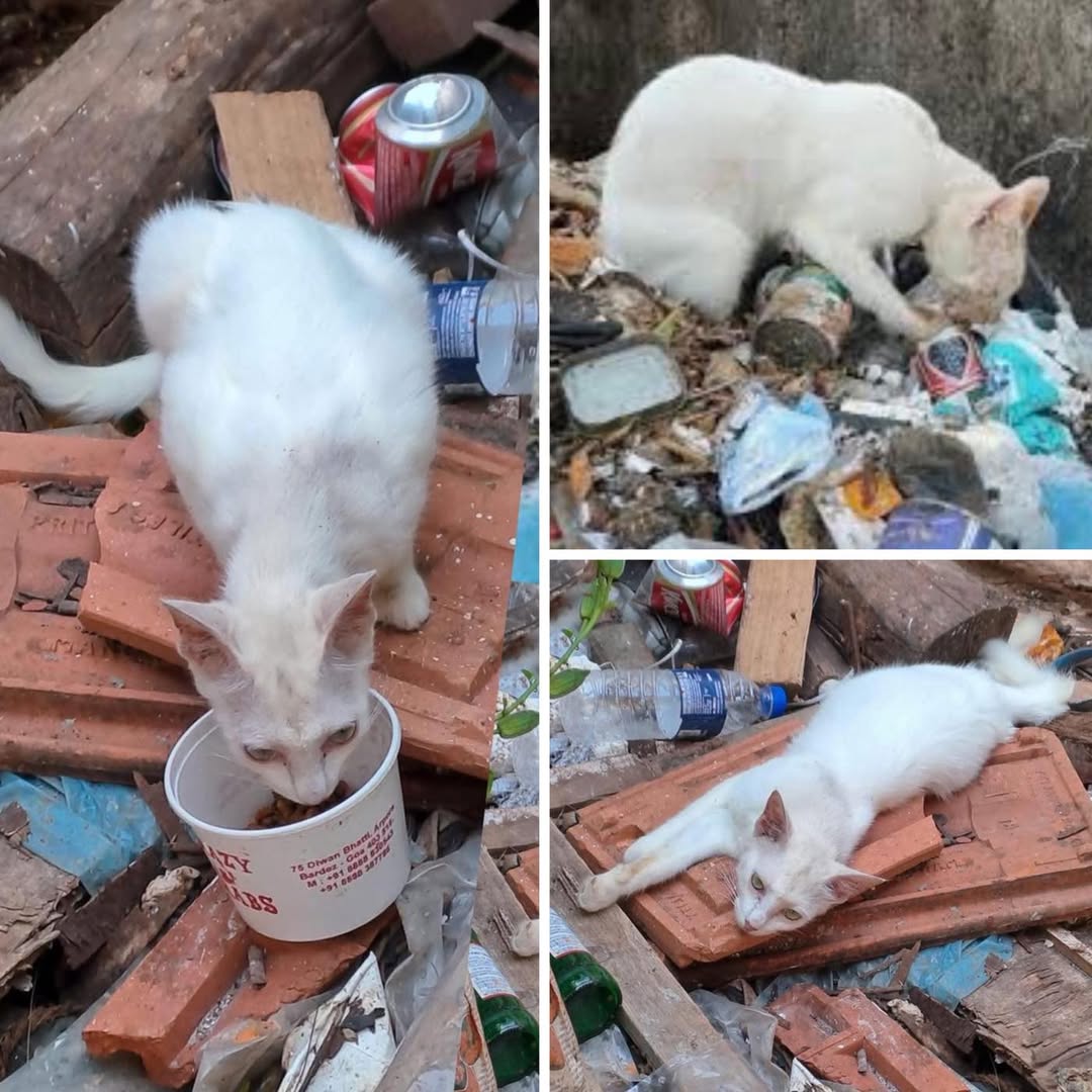 Her once-clean white fur is now stained with dirt and oil. Wounds cover her body, some from fights with other strays, others from sharp cans and glass hidden beneath the trash. She doesn’t cry, though — no one would hear her even if she did. The streets have taught her silence, patience, and pain.