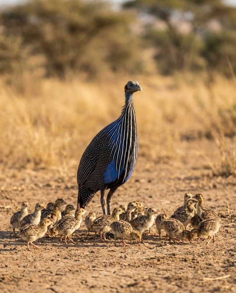 In the sunlit savannas of East Africa, this striking, long-necked sentinel strides across open ground in tight, purposeful bands. It forages for seeds, bulbs, insects, and fallen fruits, probing the soil and leaf litter with steady, synchronized movements. What makes it extraordinary is its social precision — cohesive groups that share vigilance, rotate sentry roles, and move nutrients across vast grasslands as they feed. A living mosaic of blue and black against golden plains, yet a disciplined guardian of the savanna’s balance.