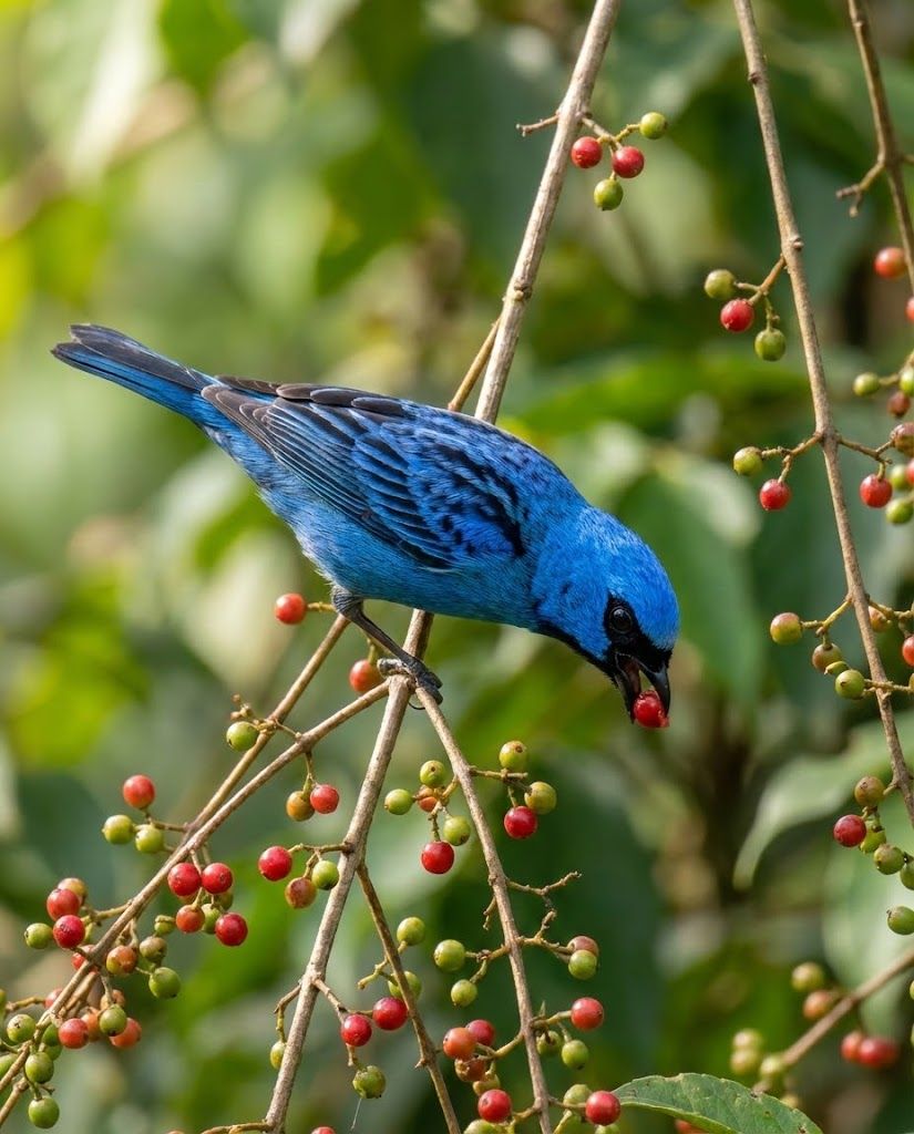 In the humid montane forests of Central and South America, this sapphire-and-ink jewel moves through the canopy with lively assurance. It feeds on ripe fruits, nectar, and small insects, flashing deep blues and velvet black as it shifts between sun and shadow. What makes it extraordinary is its quiet role in forest renewal — dispersing seeds into cool, misty understories and helping sustain plant life across mountain slopes. A bold contrast of color in drifting fog, yet a gentle architect of cloud-forest balance.