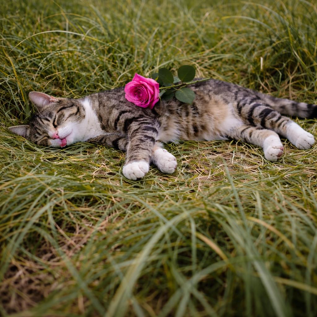 This little kitten was hit by a vehicle and left lying in the grass by the roadside. It seems like it struggled here for a long time before passing away, because the grass all around it is flattened.