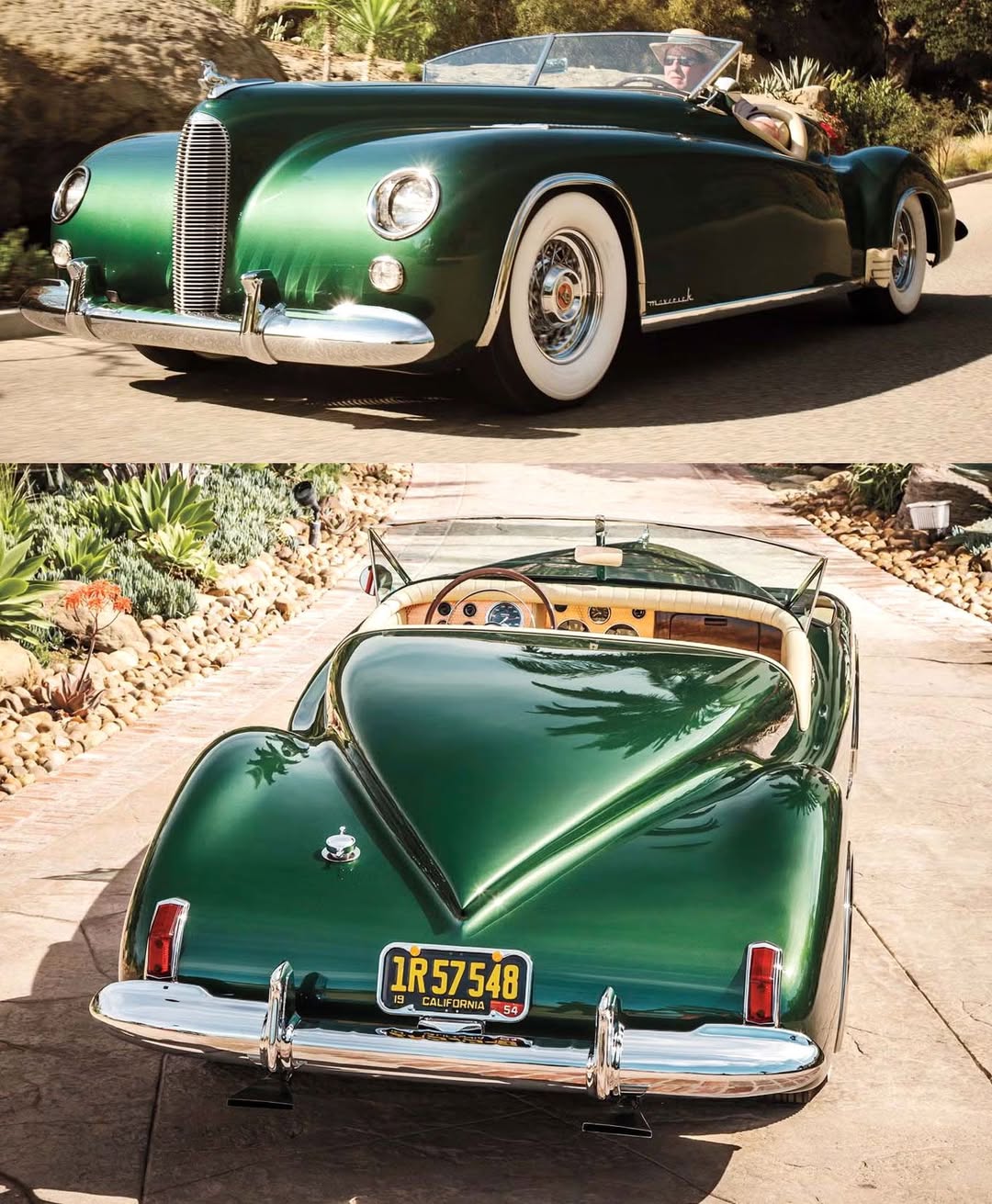 The massive body featured fadeaway fenders and a dramatic boat-shaped tail that prompted comparisons to an oversized Jaguar XK 120.