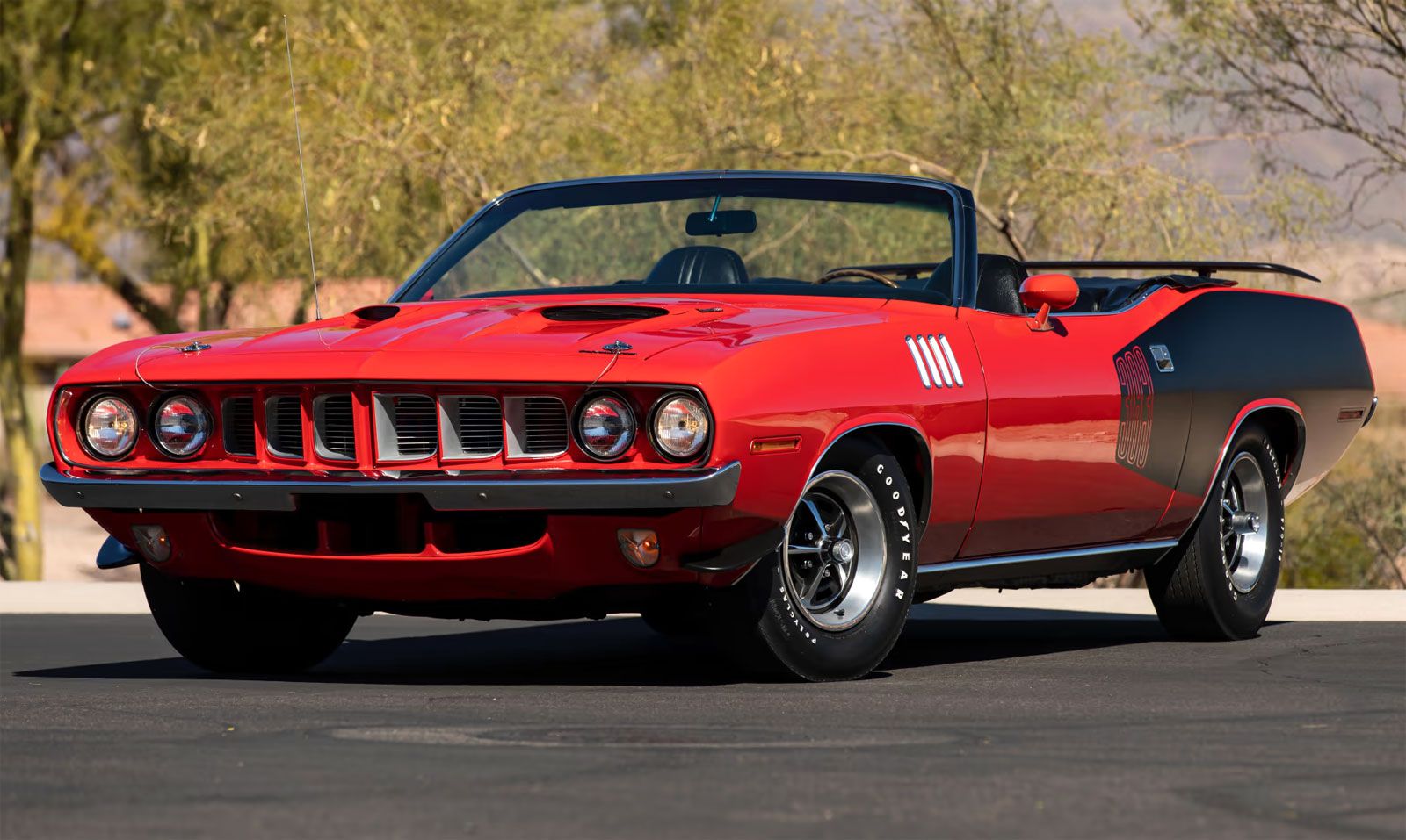 Changes for the 1971 Plymouth Hemi Cuda were minimal and included a more complex 6 inlet grille design and fender gill louvers. Only 100 or so of these were built and the seven ultra-rare 1971 convertibles are the most expensive muscle cars money can buy.