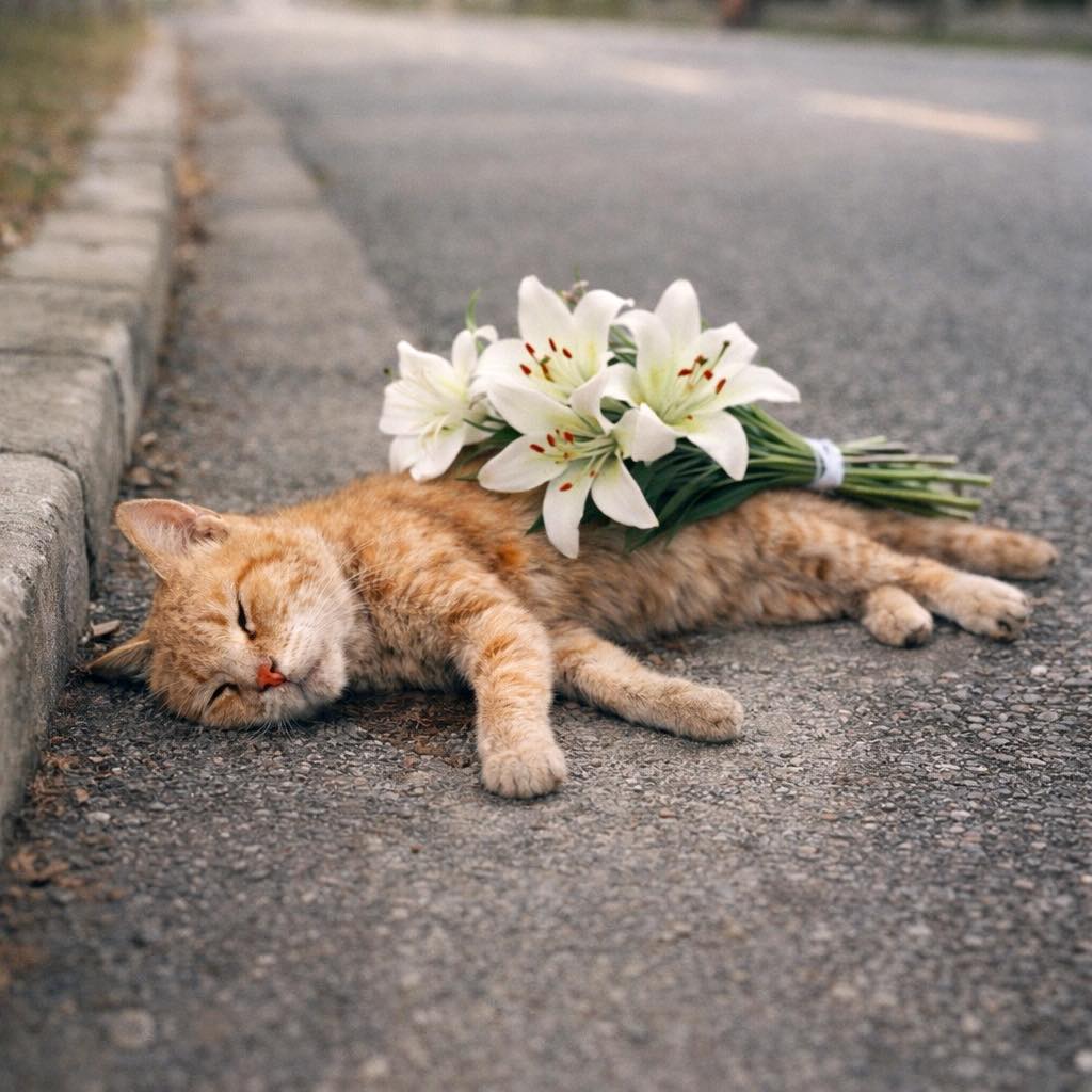 I gently moved him to the side of the road, placed the lily flowers I had with me beside his little body as a final sign of respect, and gave money to a man who was working nearby. I asked him to make sure this kitten received a proper farewell. I also gave him my phone number and requested an update with photos.
