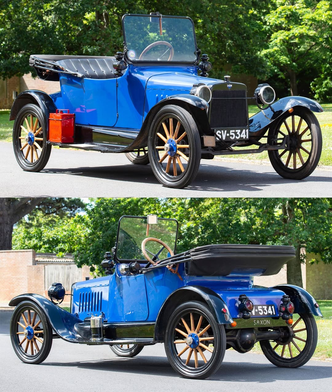 Detroit-based Saxon Motor Car Company entered the automotive market in 1913 when Ford’s Model T dominated sales. The 1916 Saxon 12.1hp Two-seater Roadster gained popularity as an affordable alternative to the Model T. With its four-cylinder engine, simple construction, and competitive pricing, production reached nearly 24,000 units in 1916. The vehicle featured wooden wheels, gas and oil lamps, and straightforward mechanics.