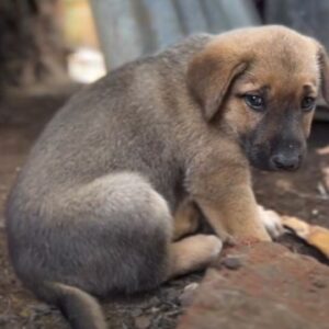 The tiny pup sat on cold dirt, still. Behind him, old metal sheets leaned like broken walls. A broken brick rested near his paws. He kept his…