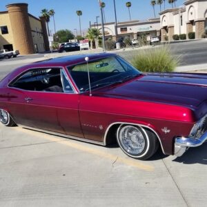 This Impala is sitting low and shining like it is ready for a Saturday night cruise. That deep candy red paint with the chrome and wire wheels…