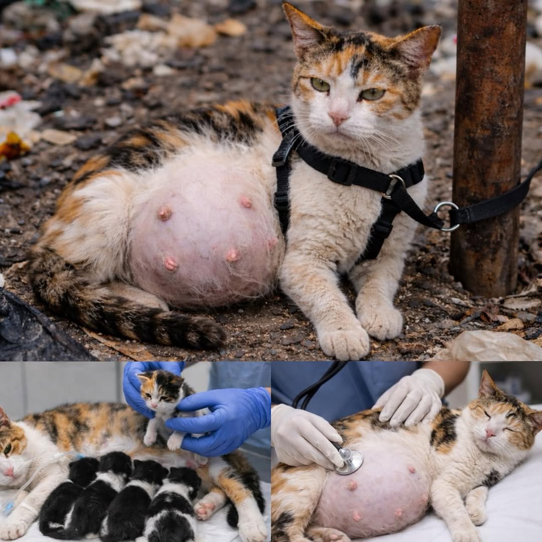 The mother cat has given birth and is now safe and recovering well. The veterinary team worked incredibly hard to save her — without them, this story could have ended very differently.