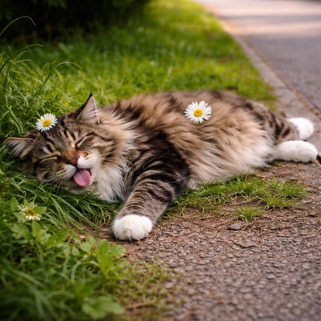 This cat was hit by a vehicle and left lying in the grass by the roadside. It seems like it struggled here for a long time before passing away.