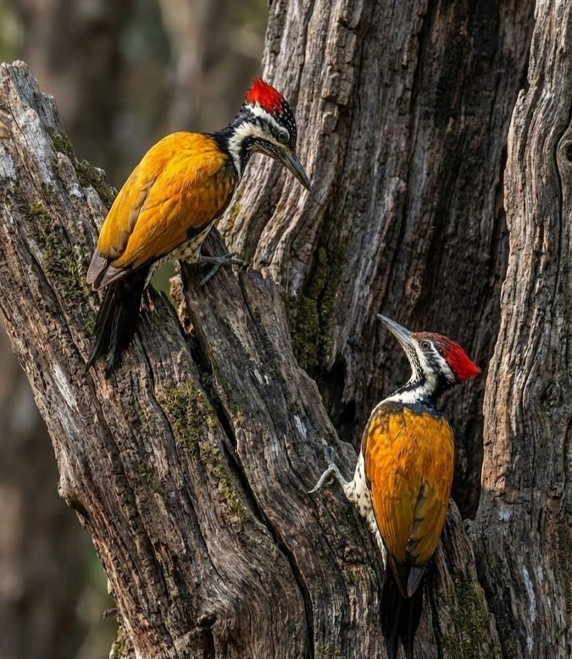 In the sunlit forests and village groves of South and Southeast Asia, these golden-backed drummers climb trunks with rhythmic intent. They hammer into bark for ants, beetle larvae, and hidden insects, pausing only to flash crimson crests and ringing calls. What makes them extraordinary is their role as forest engineers — by chiseling nest cavities later used by owls, parakeets, and small mammals, they quietly shape entire woodland communities. Bright in color and bold in sound, steadfast builders of living trees.