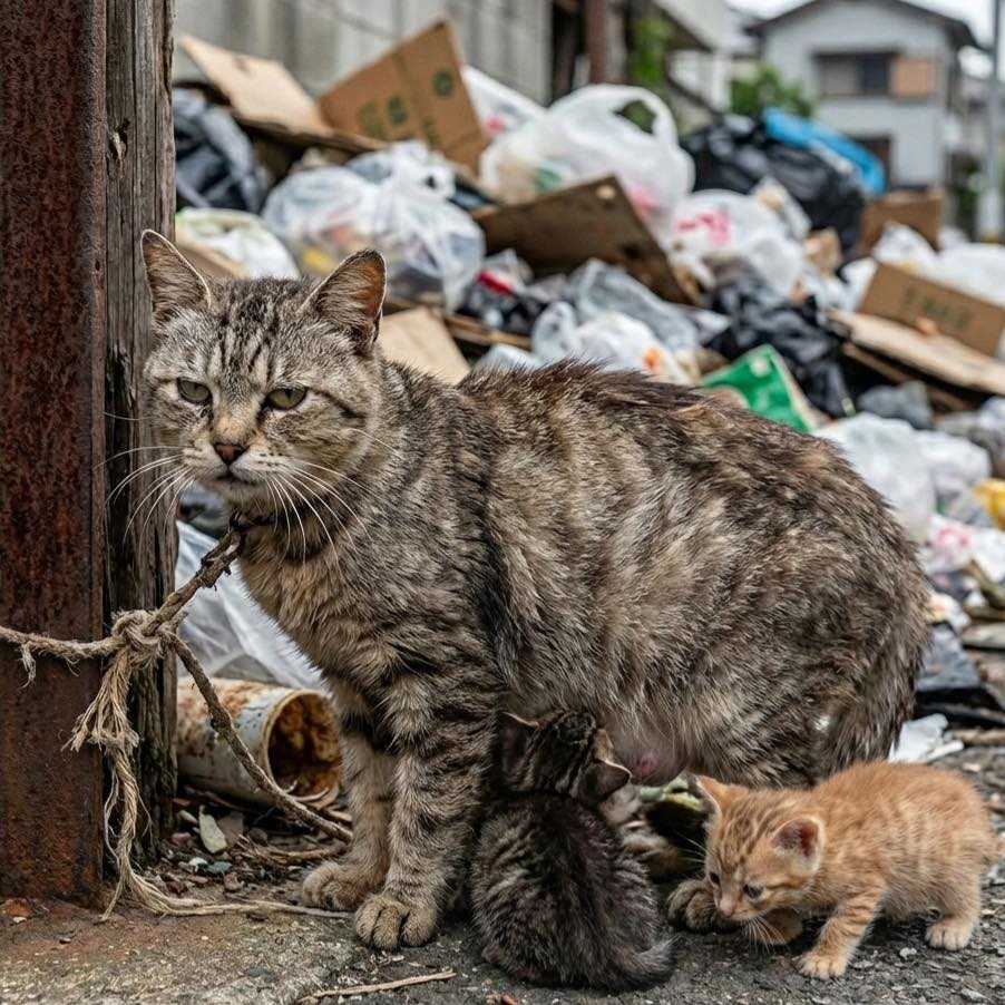 A truly heartless person tied this mother cat to a pole and abandoned her along with her kittens. I found them near a garbage dump.