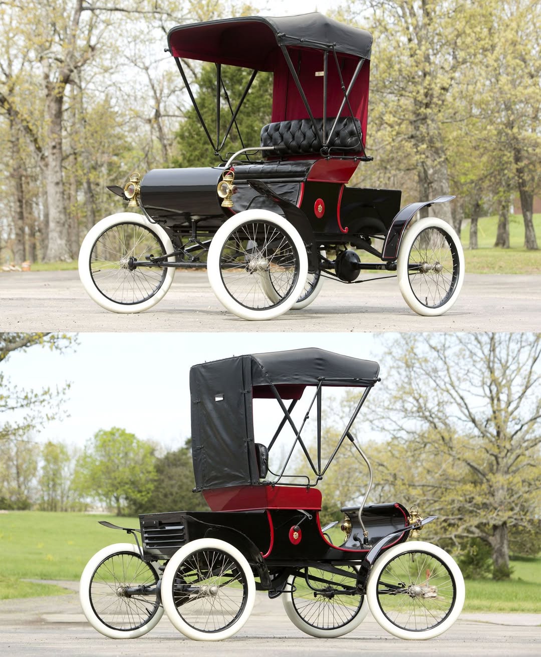 The simple black and maroon bodywork sat high off the ground on a 66-inch wheelbase, with full-length leaf springs supporting the lightweight 850-pound chassis. Steering came via a right-side tiller, familiar to those accustomed to carriages.