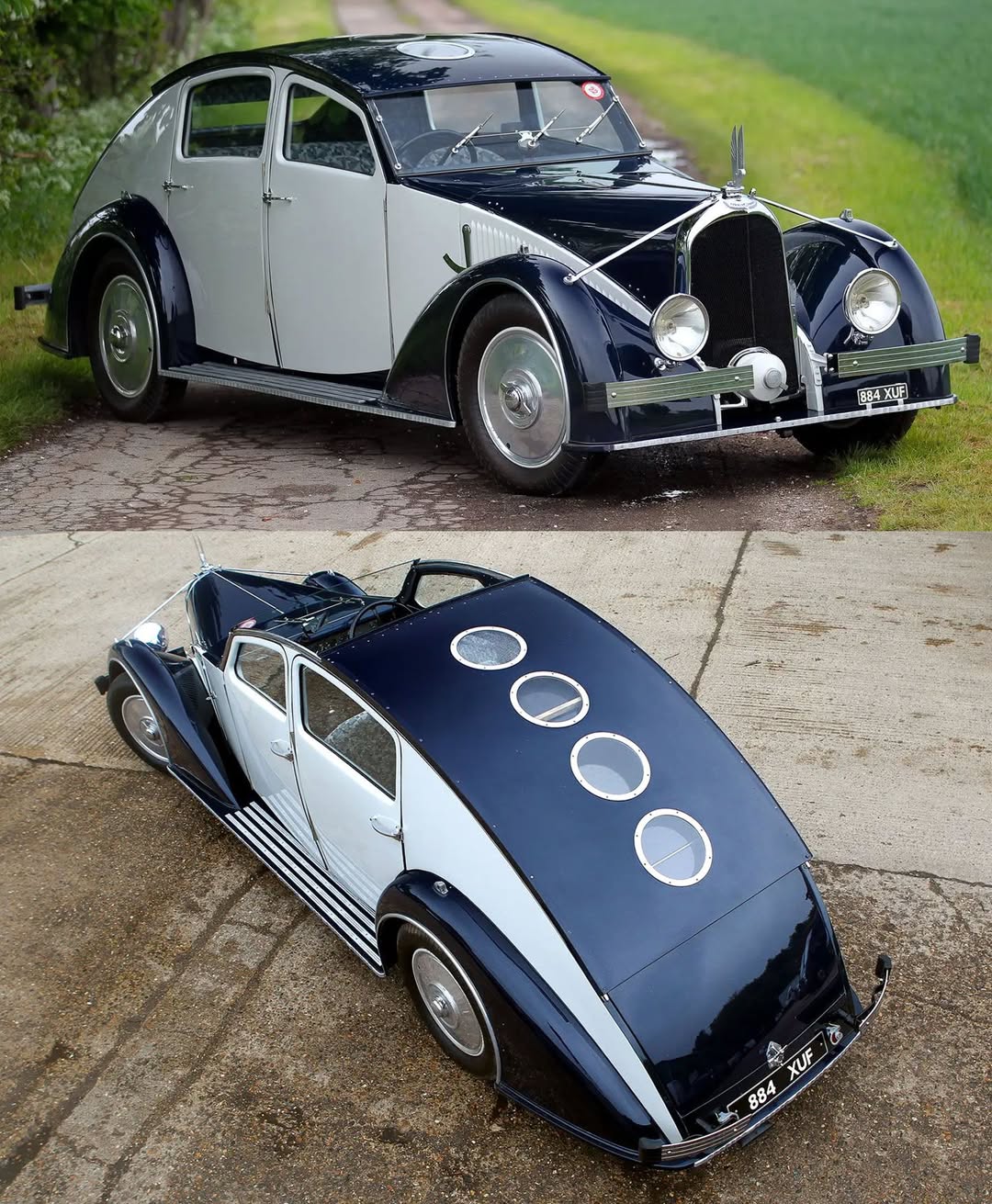The sleek fastback design incorporated flat sides, porthole windows in a pneumatically retractable hardtop roof, and wraparound fenders that referenced aircraft fuselage construction.