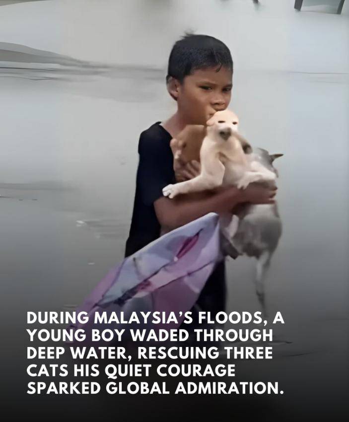 In November 2024, during Malaysia’s severe floods, a young boy bravely rescued three stranded cats from rising waters. Cradling them in his arms, he waded through danger to bring them to safety. The powerful moment went viral, inspiring millions. His act became a global symbol of hope, reminding us how compassion shines brightest in times of crisis.