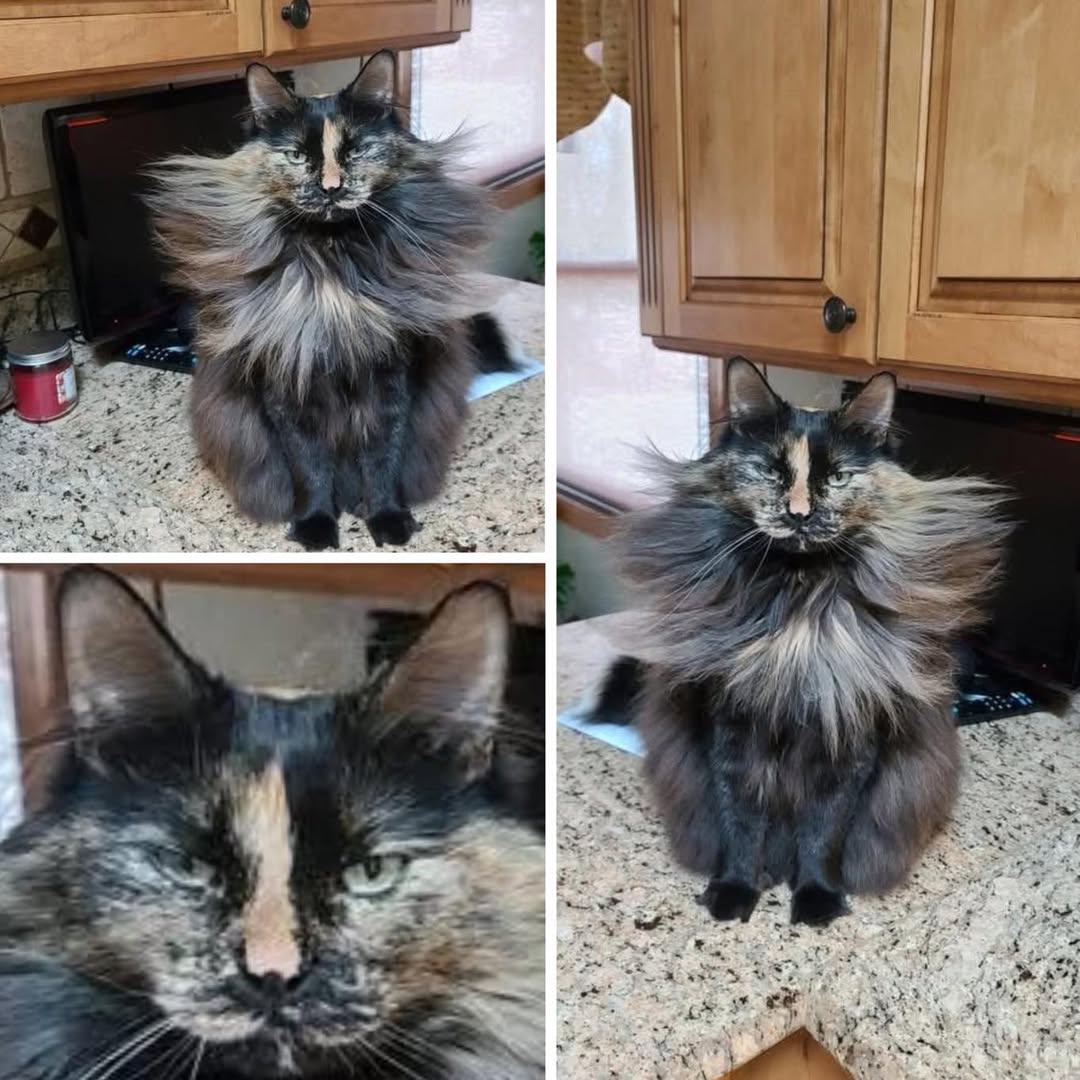 Ten minutes later, the cat emerged looking like a Victorian-era poet who just survived a wind tunnel. One side brushed, the other side expressing artistic freedom. Whiskers offended. Floof expanded to maximum volume.