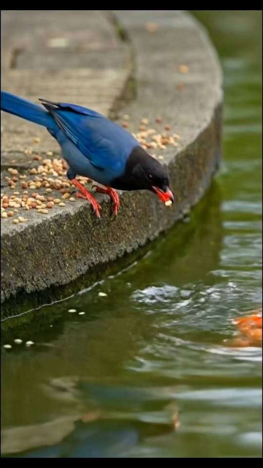 The bird feeds the fish