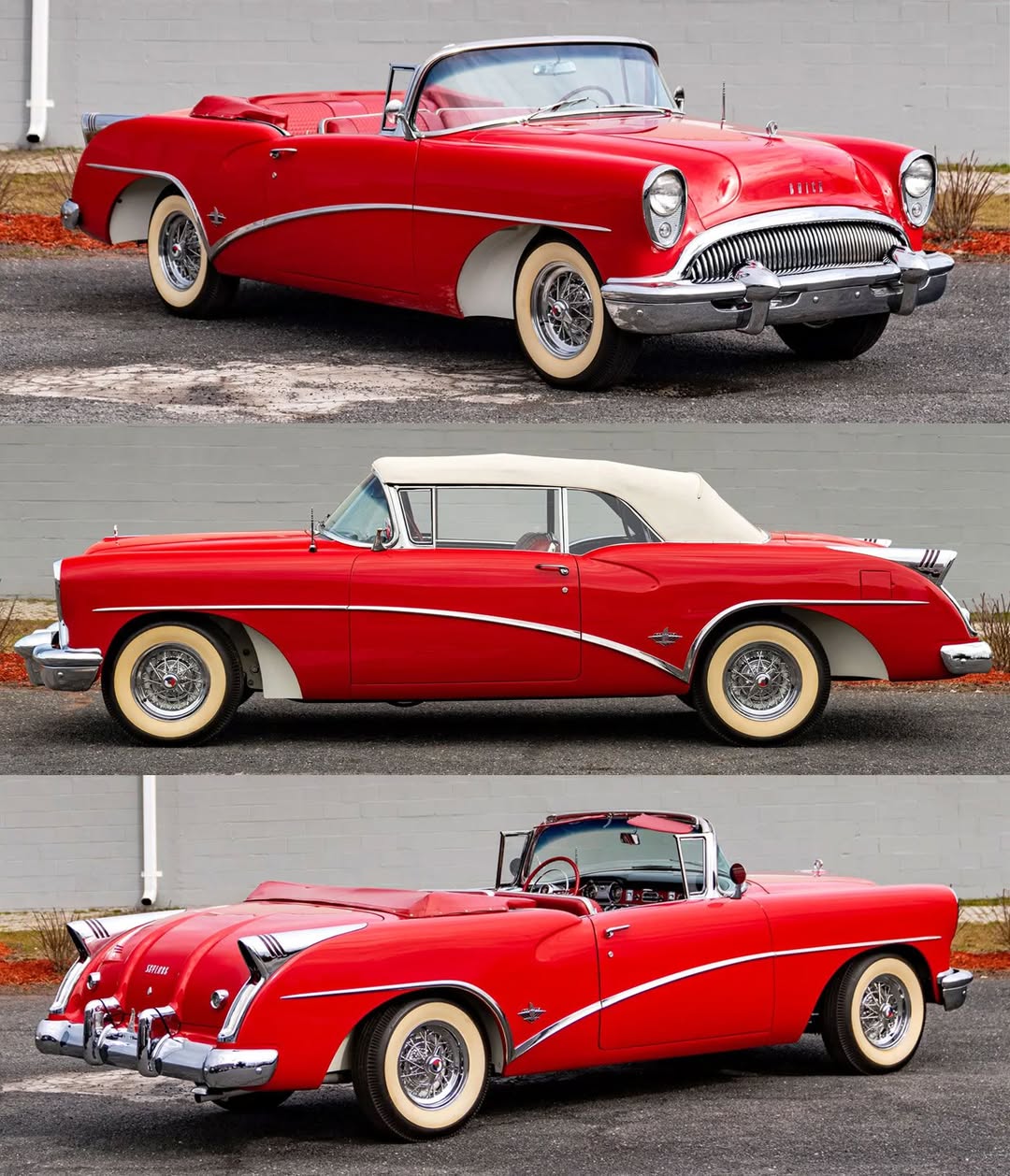 Factory customization gave this limited-production convertible its distinctive character, with cut-out front fenders revealing contrast-color inner wells that showcased Kelsey-Hayes chrome wire wheels. Sculpted rear fenders bore large chrome tailfins housing the taillights, while unique trim included a special hood ornament and heat-pressed waffled upholstery. This 1954 continuation of Buick’s successful “dream car for the public” wore new flush-sided styling that departed from its 1953 predecessor.