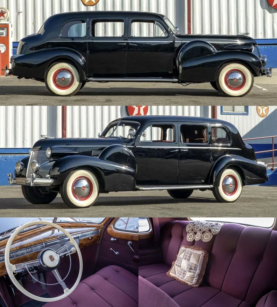 All-steel turret-top construction featured an integrated vee windshield, while exterior styling reflected Cadillac’s late-1930s pointed-nose theme with fine-pitched vertical grille bars and bullet-style parking lamps.