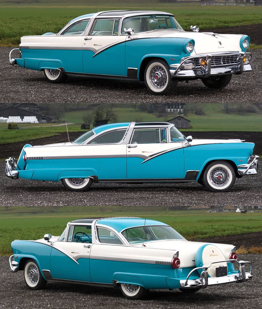 Sitting atop Ford’s 1956 lineup, the Fairlane Crown Victoria Skyliner is instantly identified by its fixed acrylic roof panel (a distinctive touch borrowed from Ford’s futuristic X-100 and X-500 concept cars).