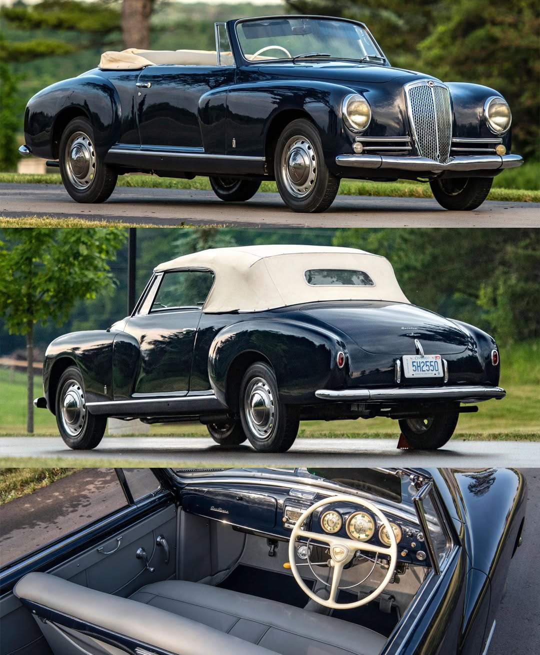 Unveiled at the 1950 Turin Motor Show, this hand-built convertible was designed by Gianni Lancia and talented engineer Vittorio Jano, featuring a truly groundbreaking 1754cc aluminum V6 engine. This technical marvel demonstrated Lancia’s trademark engineering excellence with hemispherical combustion chambers, innovative rear-mounted transaxle, and independent suspension for balanced weight distribution. Built on an extended 115-inch wheelbase chassis specifically designed for coachbuilders, the B50 featured exquisite Pinin Farina bodywork with impeccable craftsmanship evident in its precise shutlines and quality materials.