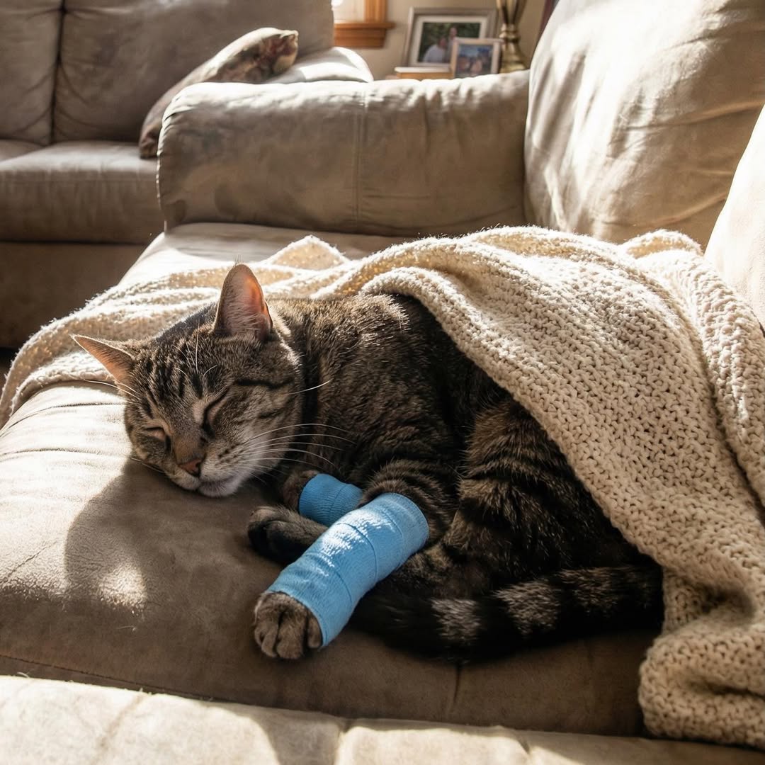 I have many rescue cats like him, and the vet said he should be able to walk again in about three weeks.