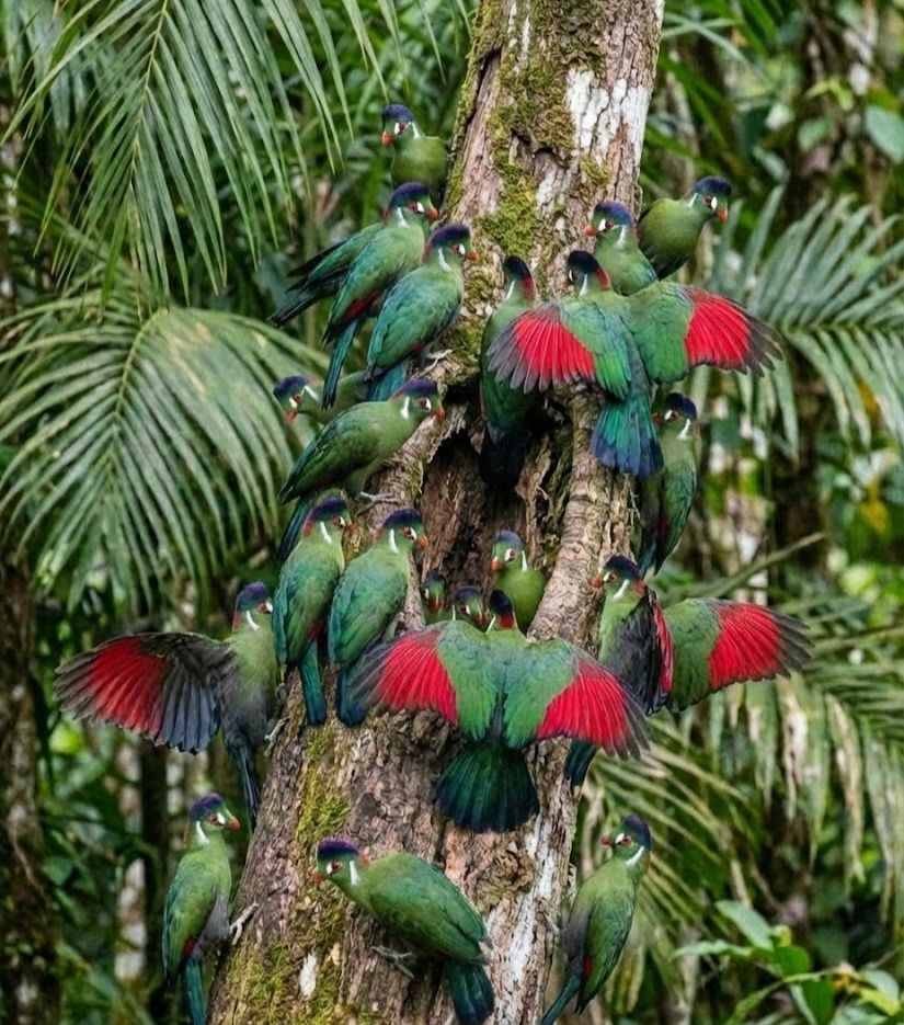 In the leafy crowns of African forests, this vivid canopy glider slips between branches with soft, gliding hops. It feeds on figs, berries, and tender leaves, choosing ripe fruit with calm deliberation as its wings flash hidden crimson in flight. What makes it extraordinary is its quiet partnership with the trees — dispersing seeds across wide forest gaps, it helps new growth take hold where few others can reach. A burst of color in motion, yet a faithful gardener of the canopy.