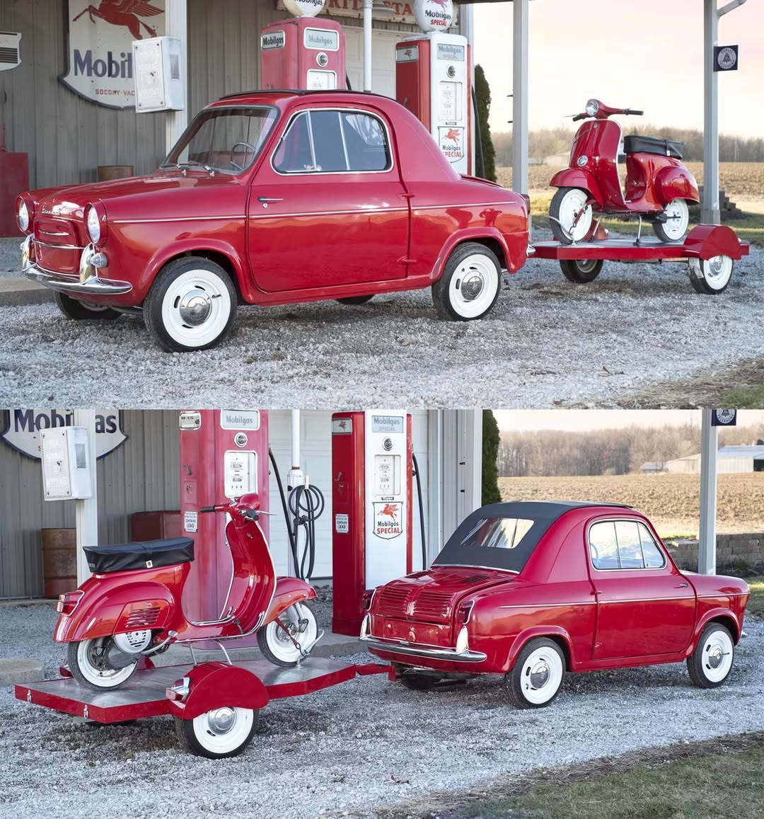 Charming and compact, the 1961 Vespa 400 (with matching trailer and Vespa scooter) represents a fascinating chapter in European microcar history. This “car-toy” was created by scooter manufacturer Piaggio in collaboration with French company ACMA, making its debut at the 1957 Paris Motor Show to compete directly with Fiat’s newly released 500. The diminutive automobile featured a rear-mounted 393cc two-stroke air-cooled twin-cylinder engine producing 20 horsepower, paired with either a 3-speed or 4-speed transmission depending on the variant.