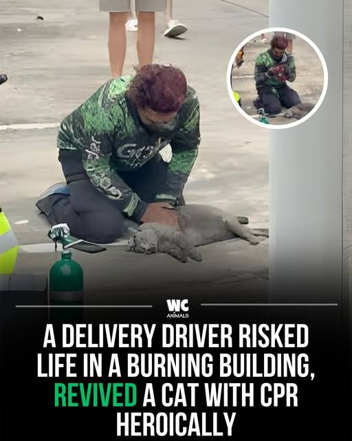 A trained volunteer firefighter, he dashed into the flames, rescued the unconscious cat, performed CPR, and rushed it to the vet.