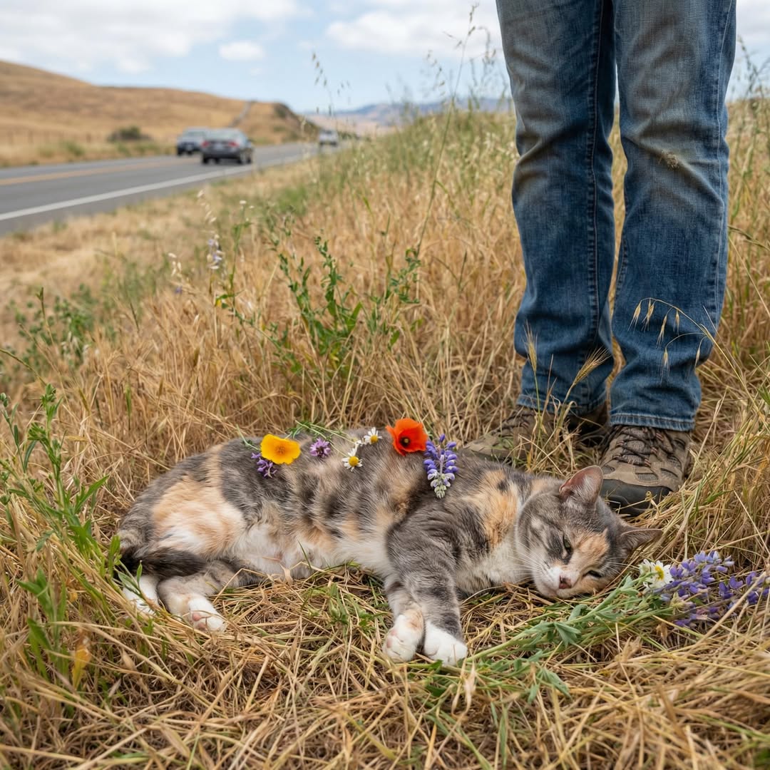 We moved the cat to the side of the road. At that moment, that was all we could do.