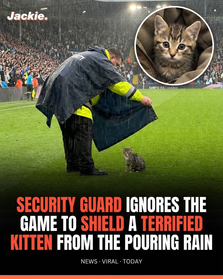 He turned his back to the field. He took his large yellow security poncho and held it open like a tent over the kitten. He stood there for the last 45 minutes of the game, getting soaked himself, creating a dry safe zone for the intruder.