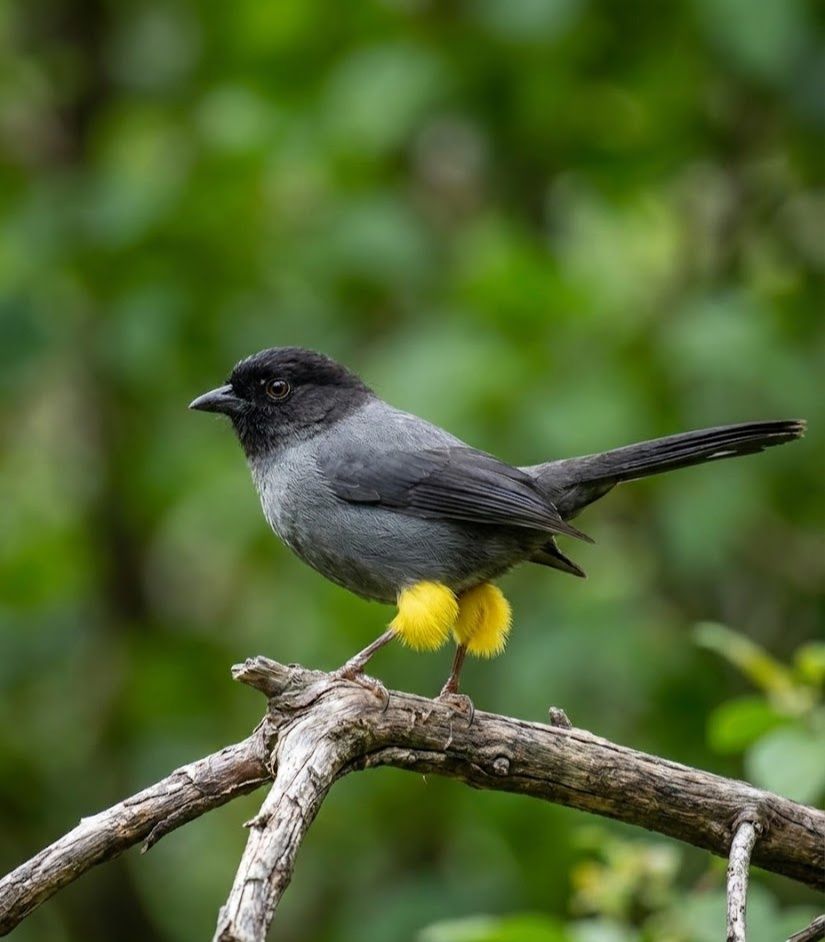 High in the cool, windswept mountains of Central America, this charcoal-and-silver wanderer flickers through stunted shrubs and páramo grass. It feeds on seeds, berries, and small insects, moving in tight, lively groups across misty ridgelines. What makes it extraordinary is its bright signal of gold — vivid yellow thighs flashing in flight against cloud-draped slopes. Living where air thins and weather shifts without warning, it helps disperse hardy alpine plants across fragile highland ecosystems. A spark of yellow in the mountain hush, yet a resilient keeper of the heights.