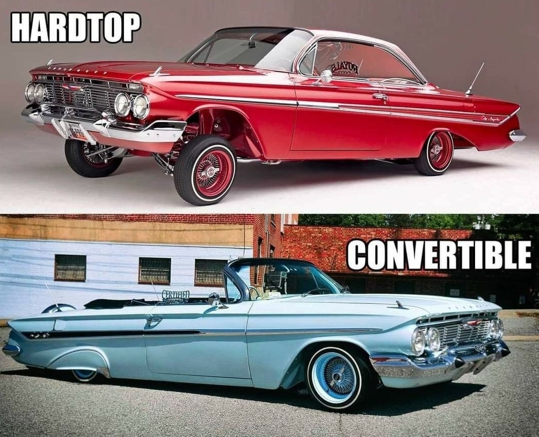 The Hardtop looks clean, sleek, and aggressive — especially laid out lowrider style with the front lifted. It’s got that classic roofline that makes those dramatic fins and chrome trim stand out even more.