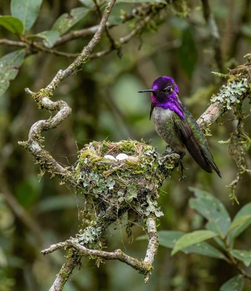Across the sun-scorched deserts and flowering washes of the American Southwest and Baja California, this tiny iridescent marvel hovers like a shard of violet light. It feeds on nectar from desert blooms — chuparosa, ocotillo, and cactus flowers — supplementing with small insects for strength. What makes it extraordinary is the male’s radiant gorget, a flaring veil of amethyst that extends into pointed “moustaches,” flashing brilliantly with every turn toward the sun. In landscapes shaped by heat and scarcity, it pollinates resilient plants that anchor fragile desert life. A pulse of purple in the shimmering air, yet a steadfast guardian of blooming sands.