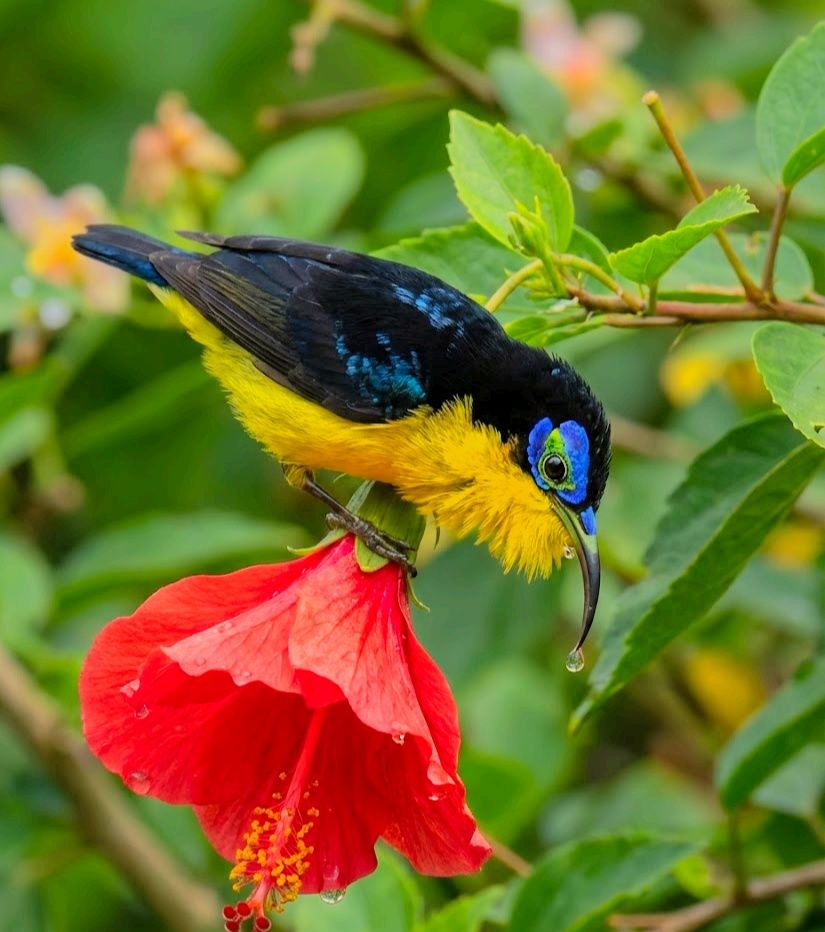In the moss-draped rainforests of Madagascar, this jewel-like forest dweller moves through filtered green light with quiet intent. It feeds on nectar, small fruits, and insects, slipping between blossoms and lichen-covered branches in the dim understory. What makes it extraordinary is the male’s vivid facial wattles — bright turquoise and cobalt patches that glow like living gems against velvety plumage. Endemic to an island found nowhere else, it pollinates rare forest plants while sustaining one of Earth’s most unique ecosystems. A flicker of neon in ancient shade, yet a devoted guardian of Madagascar’s hidden gardens.