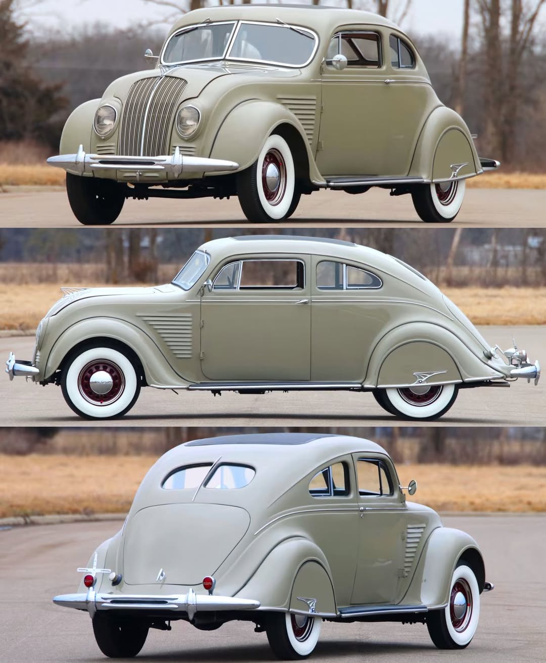 The coupe’s flowing curves and distinctive “waterfall” grille epitomized the Art Moderne aesthetic, similar to the famous Burlington Zephyr train. Both the Airflow and the Zephyr made their public debuts at the 1934 Chicago World’s Fair, capturing widespread attention for their futuristic looks.