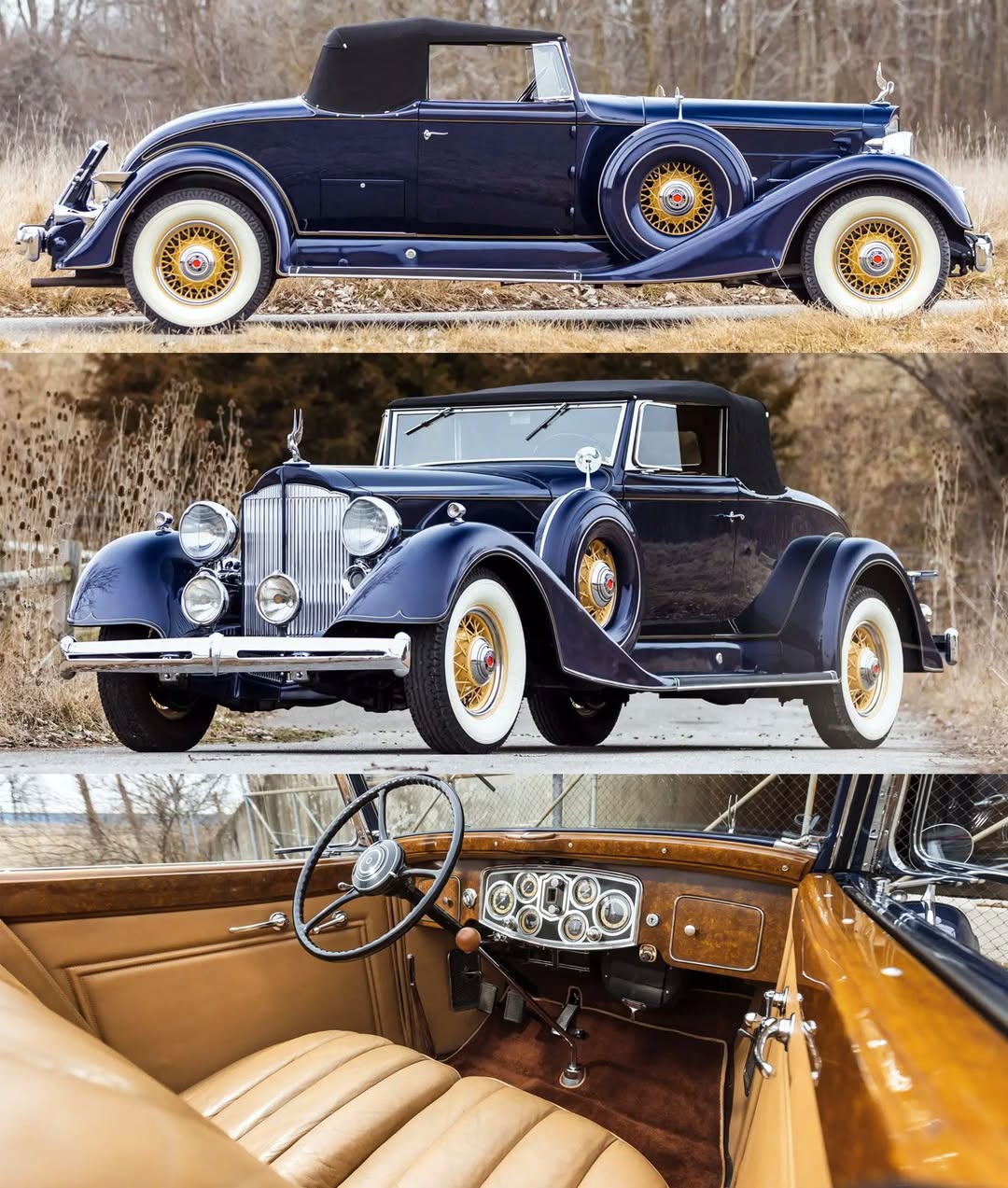 Factory options frequently included dual driving lights, dual horn trumpets, dual side-mounted spare tires with covers, Trippe-style or Packard-branded accessory lights, mirrors, and luggage racks.