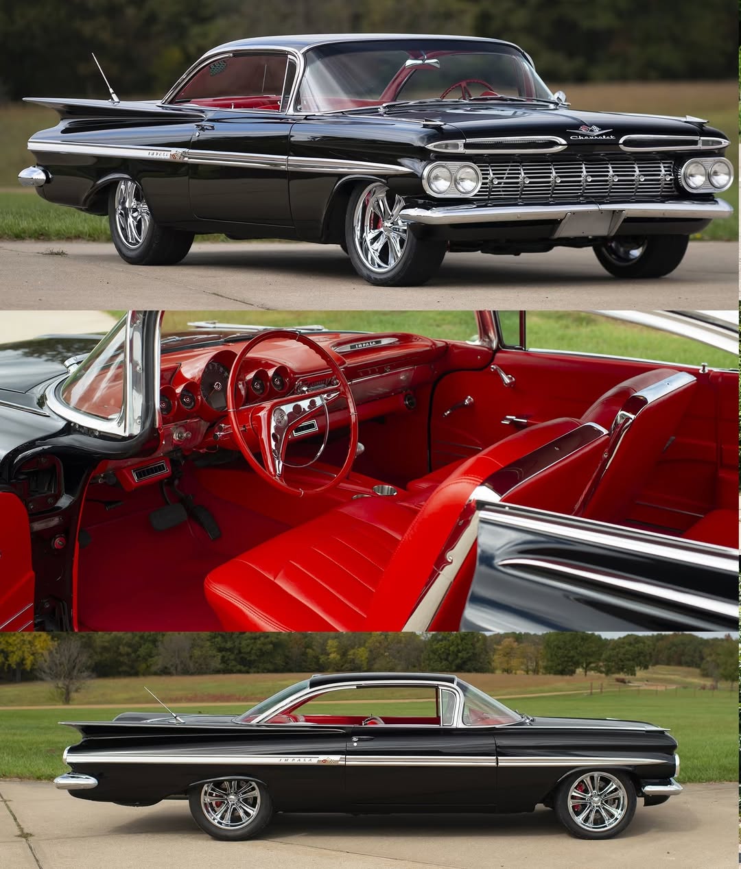 That wide chrome grille, the big fins out back, and that red interior against the black paint is just classic Chevy style. These cars were bold from the factory and still turn heads like nothing else.