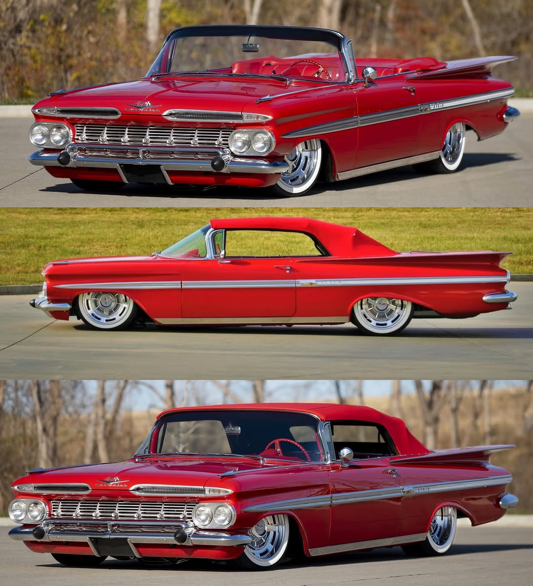 1959 Impala Convertible and it does not get more iconic than this. Those wide chrome grilles, long fins and that bright red paint just scream late 50s style. Top down, white walls shining and nothing but open road ahead.