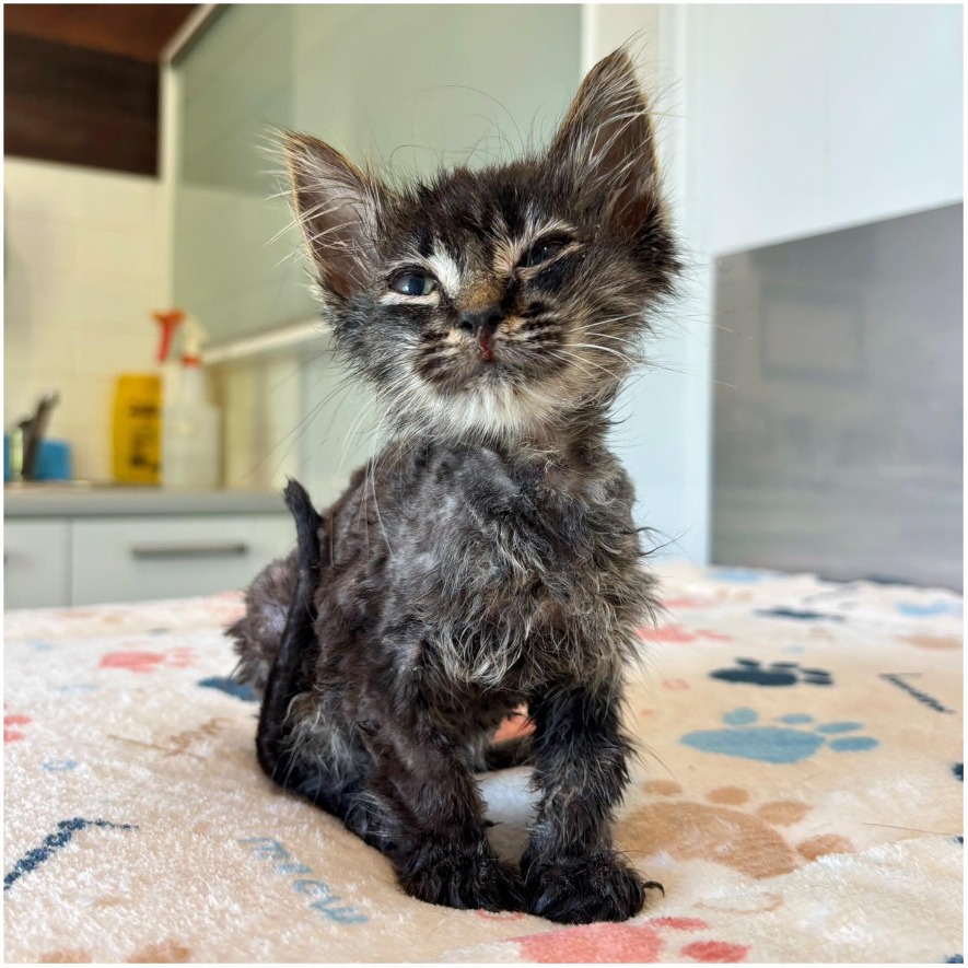 This tiny tabby boy was found yesterday in an industrial area, trapped inside a container of strong adhesive. He was completely stuck, the glue had covered every inch of his fragile little body. By the time he arrived, he was exhausted, frightened, and in a truly heartbreaking state.