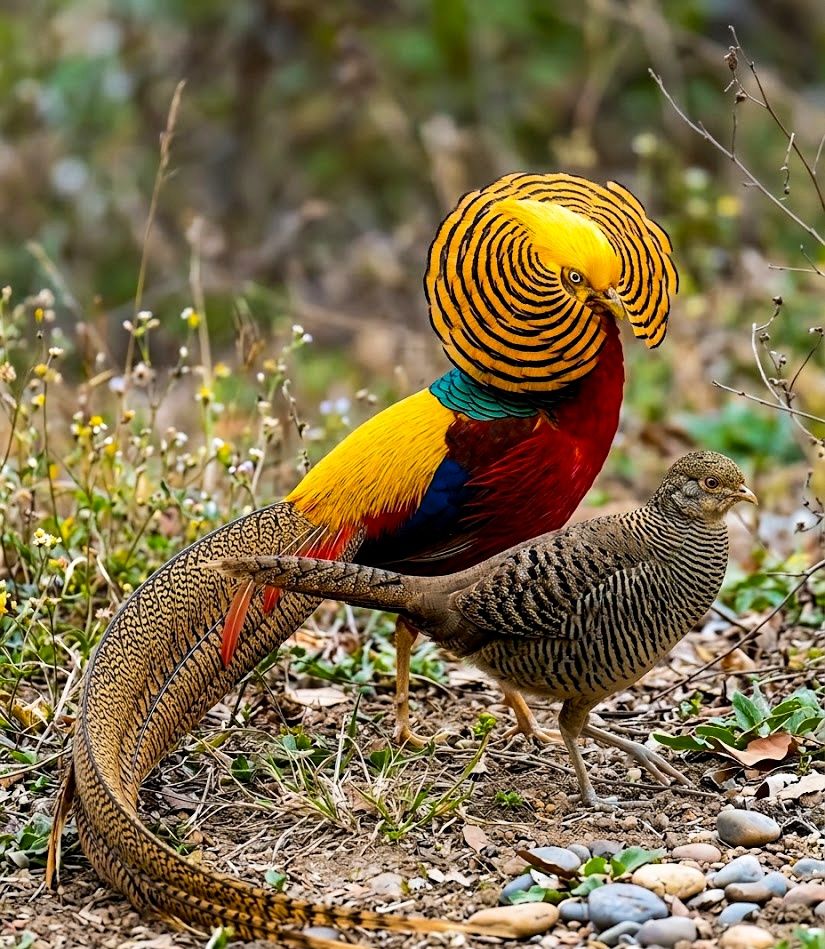 In the cool mountain forests of western China, these radiant ground dwellers move through bamboo and leaf-strewn clearings like living embers. They feed on seeds, shoots, berries, and small insects, scratching gently at the forest floor with steady purpose. What makes them extraordinary is the male’s cascading display — a mantle of molten gold, crimson body, and sapphire-blue accents that blaze brilliantly when fanned in courtship. A procession of color against shadowed hillsides, yet quiet stewards of the mountain woods they roam.