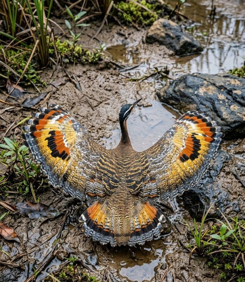 Along the shaded rivers and forest streams of Central and South America, this quiet wader moves with patient, deliberate steps. It feeds on insects, small fish, and aquatic creatures, stalking the water’s edge where current and shadow meet. What makes it extraordinary is the sudden revelation of its wings — when threatened, it spreads them wide to unveil bold, eye-like patterns in rust and gold, a startling illusion meant to freeze danger in its tracks. Subtle and secretive by the water’s edge, yet a master of surprise in the dappled light.