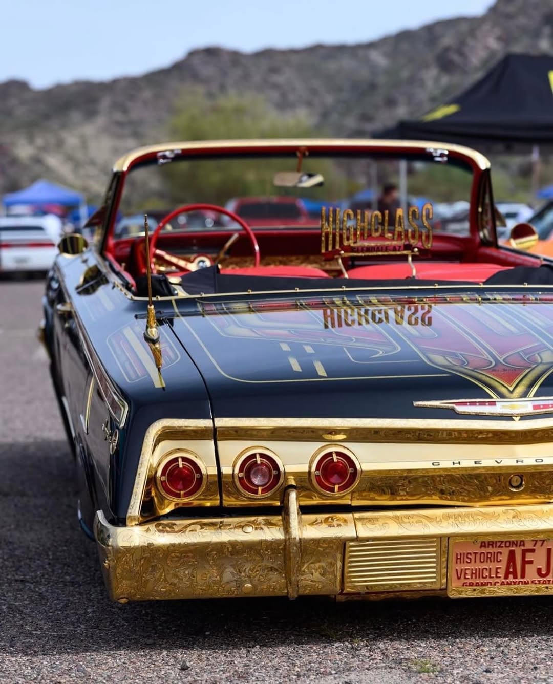 The gold trim and engraving against that deep paint with the red interior just hits different. Clean lines, triple tail lights, and that detailed rear bumper show how much time and pride went into it.