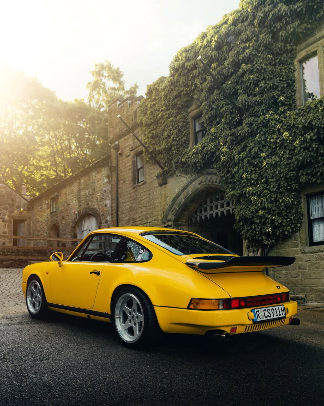 The exterior carries Yellow Bird-style body components, giving the narrow-body 911SC the wide, aggressive stance associated with that car. Mechanically, the 911SC’s original drivetrain was replaced with a Ruf five-speed gearbox and limited-slip differential.