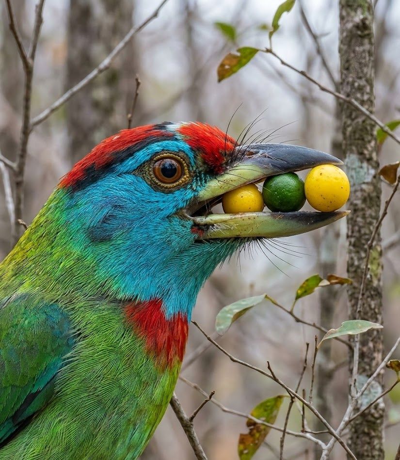 In the humid, fruit-laden forests of South and Southeast Asia, this emerald-and-sapphire sentinel perches calmly among fig trees heavy with ripeness. It feeds on soft fruits, berries, and hidden insects, its stout bill perfectly shaped for tapping and tearing. What makes it extraordinary is its devotion to fruiting cycles โ swallowing seeds whole and carrying them far beyond the parent tree, helping dense forests renew from within. A vivid flash of blue at the throat, yet a quiet architect of the canopy.