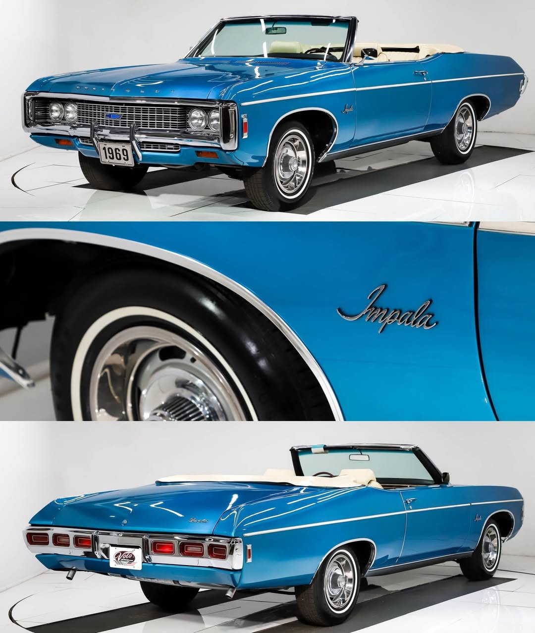 69 Chevy Impala convertible is a perfect cruiser. That bright blue paint with the white interior makes it pop, and the straight lines give it that smooth late 60s style. With the top down and those classic chrome details, this is the kind of car that was made for sunny days and slow drives down the boulevard.