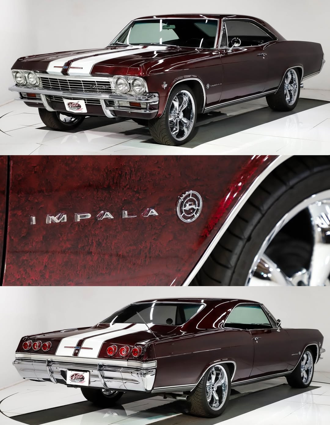 65 Impala looks absolutely mean. The deep burgundy paint with the white racing stripe gives it that perfect muscle car vibe. Sitting on those chrome wheels with the classic body lines and quad tail lights in the back, this car just has that aggressive but clean 60s style that never gets old.