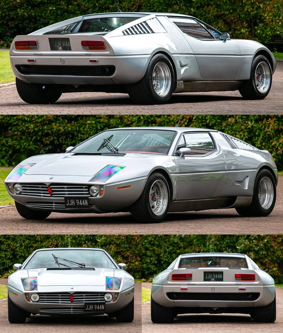 Finished in silver over red leather, the car rides on three-piece Gotti split-rim wheels in staggered 15-inch fitments with ultra-wide rear tires. The original Maserati mechanical components were retained.