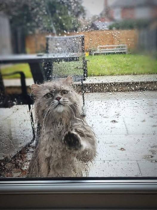 On a cold, rainy afternoon, a scruffy gray cat named Oliver stood outside the glass door, drenched and shivering. His wide, pleading eyes stared inside, one tiny paw gently pressed against the wet glass. The garden behind him was blurred with raindrops, the storm having caught him in one of his usual neighborhood adventures.