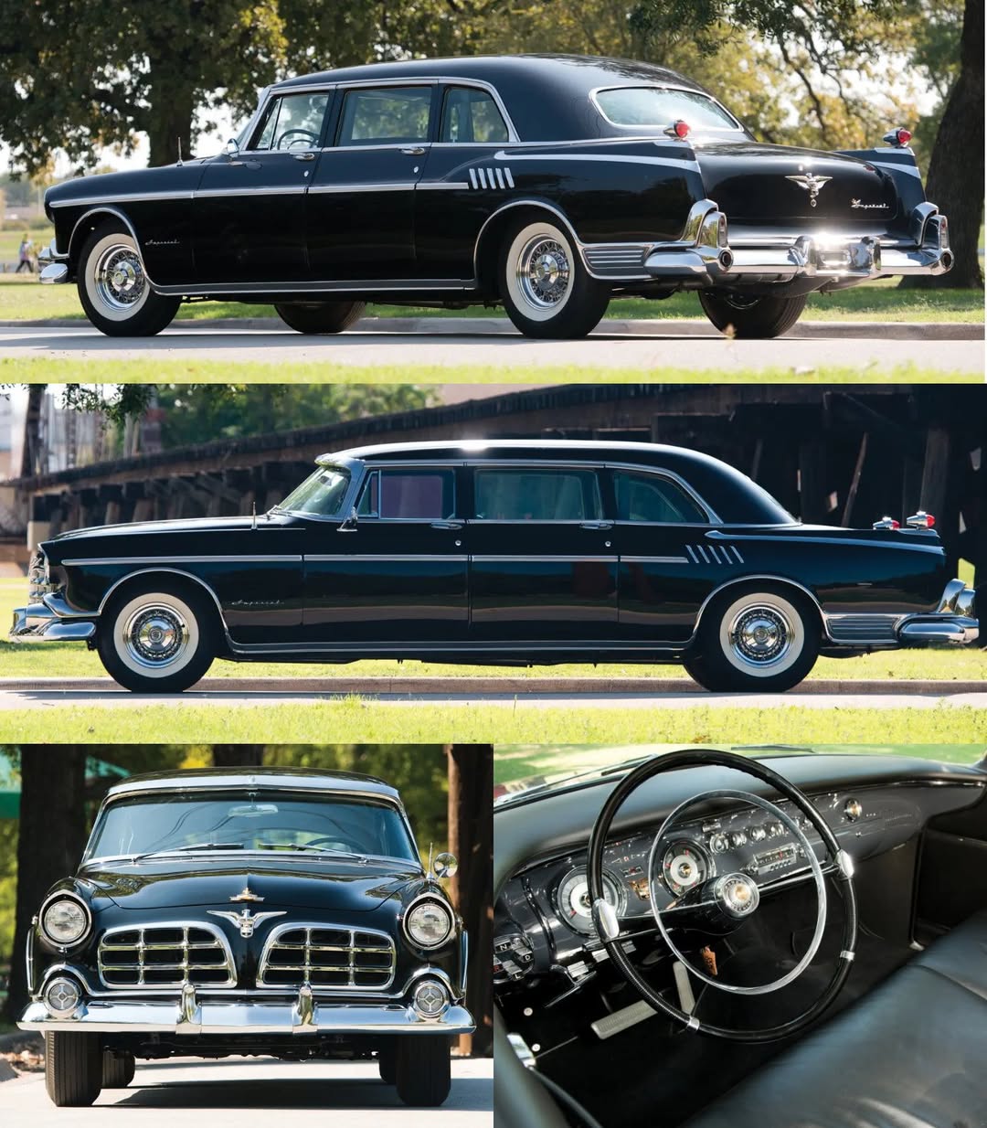 Built on a 150-inch wheelbase (17 inches longer than standard Imperials), these limousines featured seating for eight with three in front, three in rear, and two on fold-down jump seats.