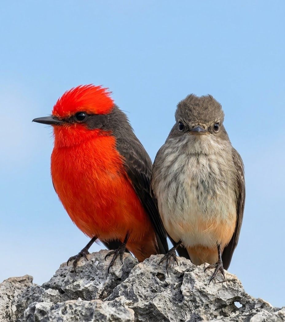 In the sunlit deserts and open woodlands of the Americas, this tiny blaze of red waits patiently on a low perch. It watches the air with sharp focus, then darts out in a swift arc to snatch a passing insect before returning to the same branch. What makes it extraordinary is the male’s brilliant vermilion glow — a burst of living fire against dusty landscapes and pale skies. A small hunter of the open air, yet a radiant spark of the wild.